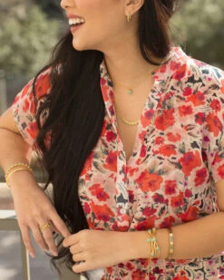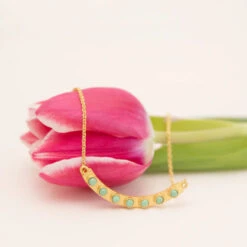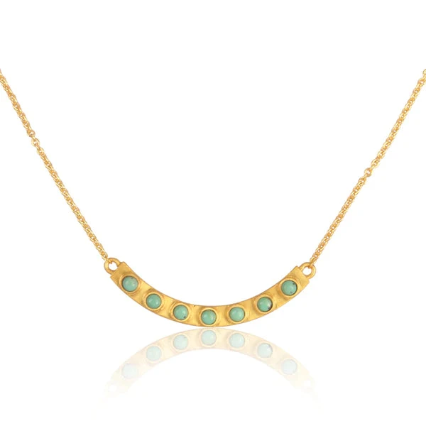 Sometimes it’s the simple details– like the addition of the gold bar necklace– that make an outfit unforgettable. This gold necklace features a brushed, curved gold bar inlaid with round turquoise stones. Designed from brass plated in 18K gold, this necklace has a 16-inch chain length that can be extended up to 2 inches. The brushed detailing of the gold bar centerpiece is a small detail that makes the turquoise stones pop. Style this 8K gold necklace on its own at the office or create a layered look with our Luxe Layering Necklace in turquoise or our Enchanted Lariat Necklace.