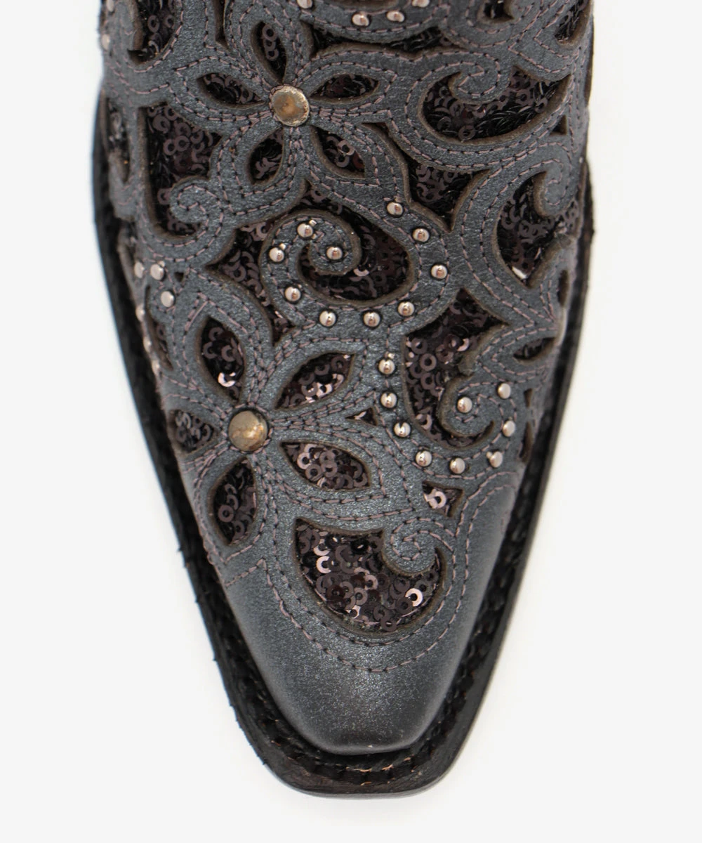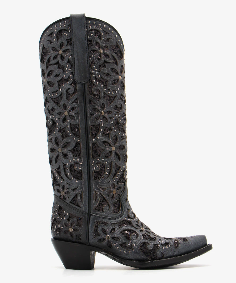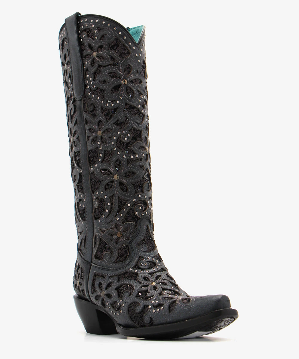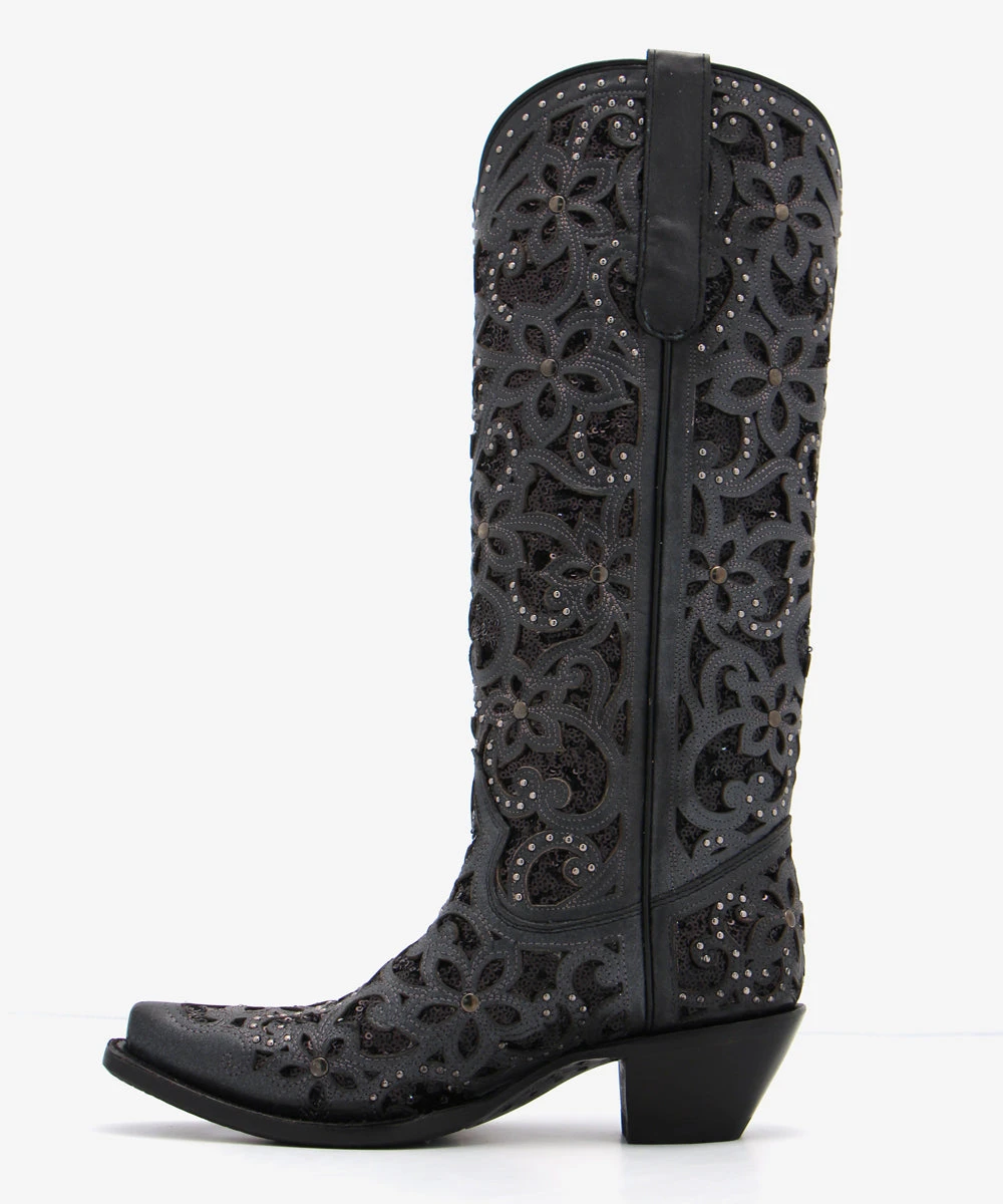 Material: Black leather and feature an ornate glitter inlay accented with dozens of metal studs
