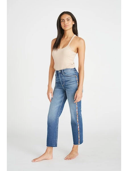 Our Driftwood Royce x Kaleidoscope jeans offer a fresh take on classic denim. Crafted by driftwood denim with a medium wash and side embroidered detail, these jeans deliver effortless style with an elevated twist. Show off a cropped hemline and stand out in bold fashion!