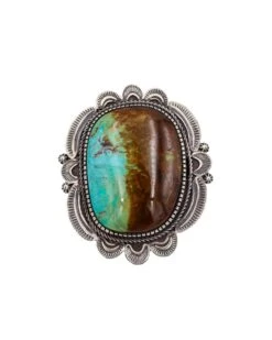 Turquoise and brown ring features a unique Royston Turquoise stone and a scallop frame with ornate detail. With its rich brown and turquoise contrast, the Extra Large Turquoise And Brown Scallop Frame Ring is sure to add a bold and stylish statement to any look.