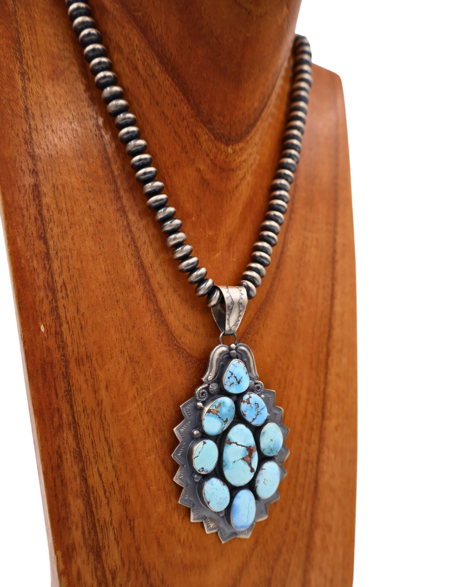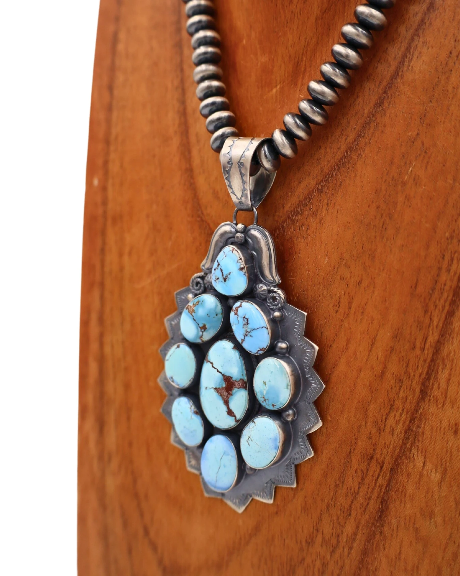This exquisite pendant features nine stunning Golden Hills Turquoise stones, creating a beautiful and unique piece of Western jewelry sure to leave an impression. Whether you are buying it for yourself or giving it as a gift, this captivating pendant is sure to delight!