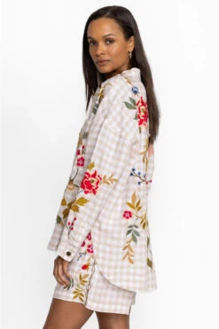 Quintessential gingham with a modern twist, the Adele Gingham Pocket Overshirt takes this this classic pattern to new heights. Cloaked in floral bouquets and delicate vines, this 100% linen blouse with a snap button front features placement embroidery as a decorative adornment. This brilliant combination pairs perfectly with traditional chinos and leather flats. Product Details: •100% Linen •Placement Embroidery •Snap Button Front      • Model Height: 5’8″ • Model is wearing a size Small • Measurements for Size Medium: Bust- 49 1/2″, Length- 27″ • Care instructions: Machine wash cold only. Non-chlorine bleach when needed. Tumble dry low. Warm iron.