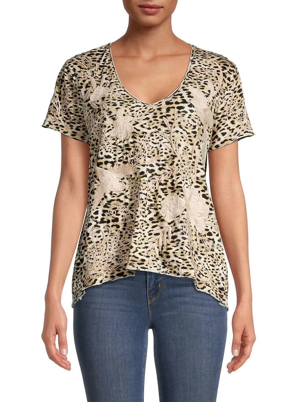 Crafted of cotton with a leopard print and floral embroidery, the Frankie T-shirt from Johnny Was is finished with a plunging V-neck.