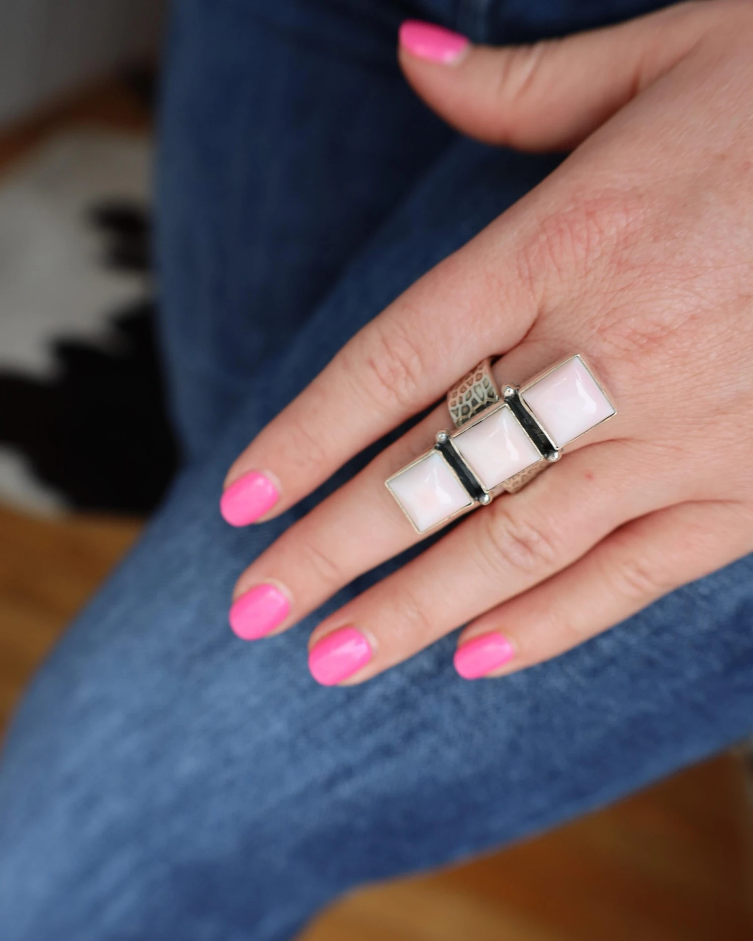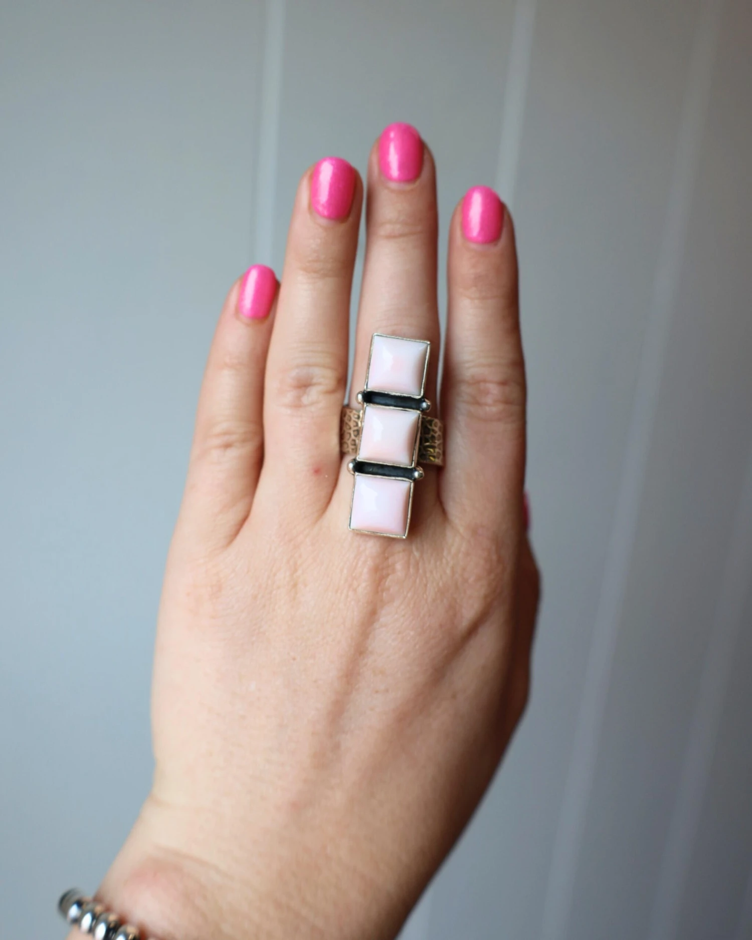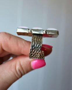 Crafted from high-quality sterling silver, this ring is both durable and stylish. Measuring about 1.5 inches long, the ring is adorned with three small pink conch shell squares on the face, adding a touch of elegance and charm to the piece. The sterling silver hammered band creates a beautiful contrast and completes the Western-inspired look.