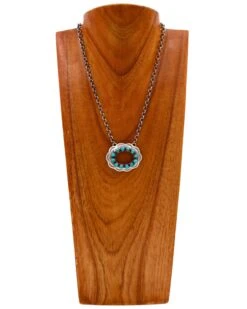 Introducing our stunning country western necklace featuring an open sterling silver oval pendant with a scalloped edge and small turquoise dots in the center. This necklace exudes a punchy aesthetic and will instantly elevate any outfit with its unique design and attention to detail.