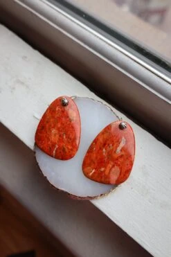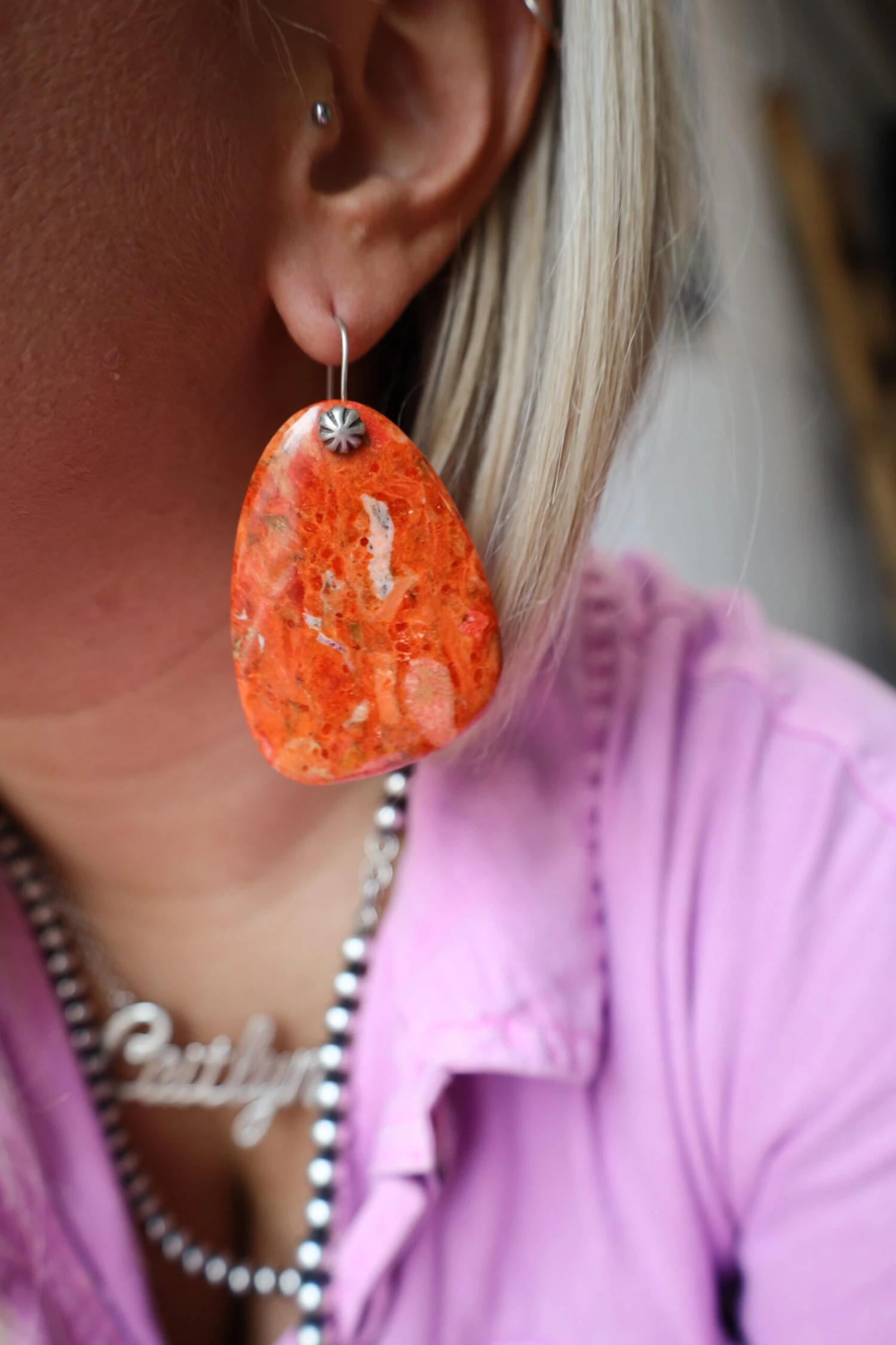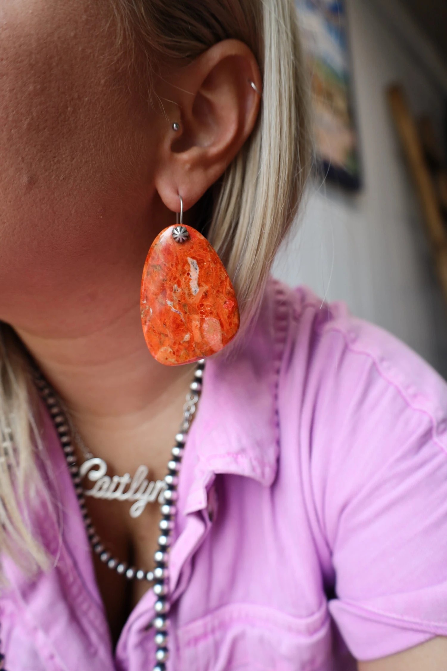 Discover the beauty of our Peyote Bird Extra Large Spiny Oyster Slab Earring. Crafted with vibrant orange hues, this eye-catching accessory is sure to draw attention. Makes a great gift for a special someone or simply a reward for yourself. Let your true beauty shine with this unique and extraordinary earring. Dare to be bold!