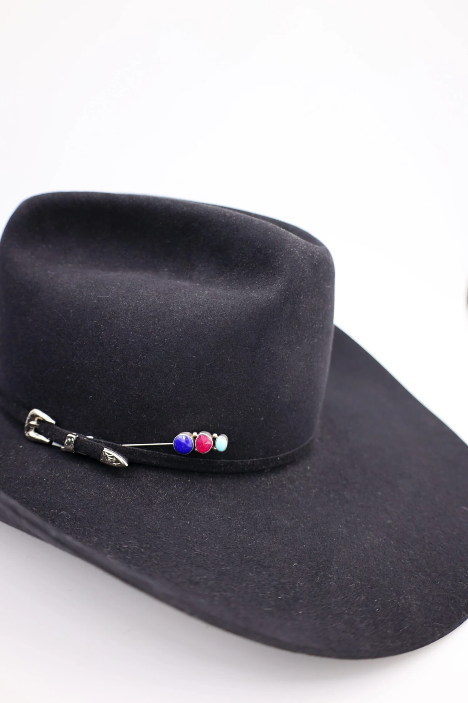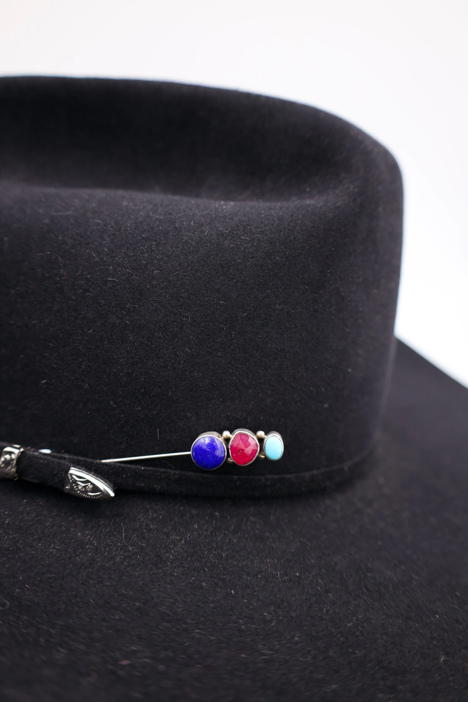 Add some sparkle to your cowboy hat with a Peyote Bird Turquoise, Purple and Blue Stick Hat Pin. Customize your look and show off the precious stones and unique design. Featuring a one-of-a-kind design, are you ready to liven up your cowboy hat with a Peyote Bird Hat Pin?
