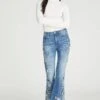 This style comes in a dark wash denim with a metal button closure and a zip fly. The Teagan has a chic slit detail at each ankle — the perfect complement to a statement shoe.Â
