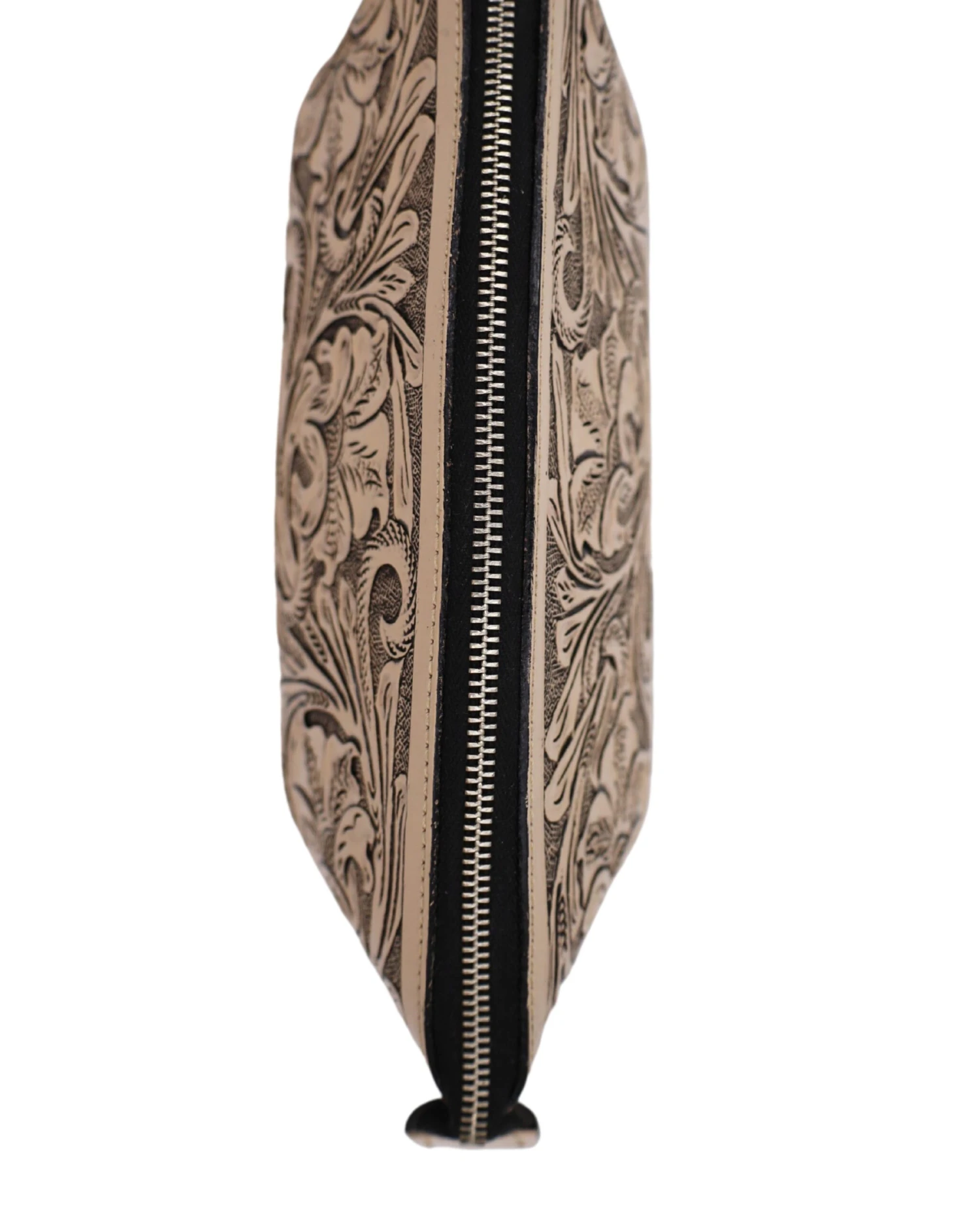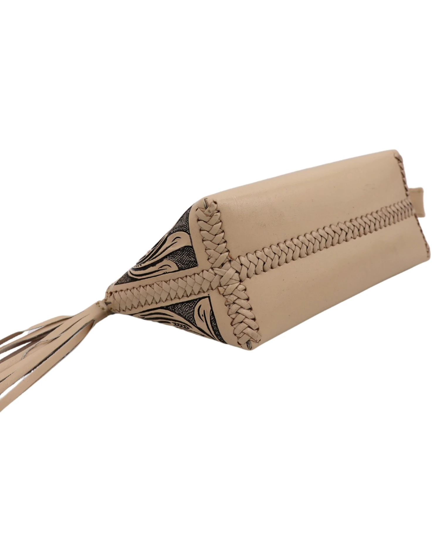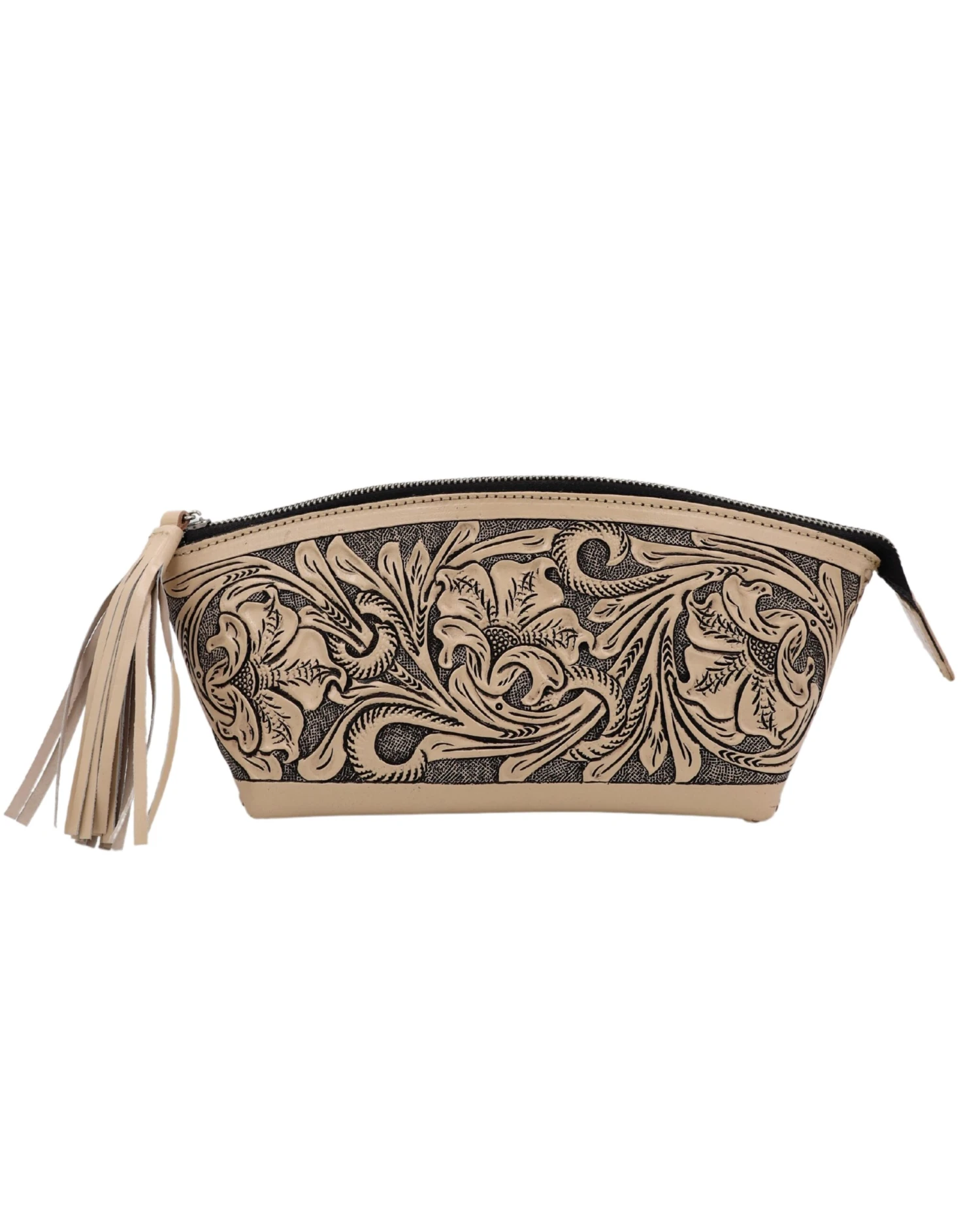 This Que Chula genuine leather cosmetic bag features a beautifully intricate floral engraving that makes it truly stand out. It also has a zipper enclosure with a leather tassel.