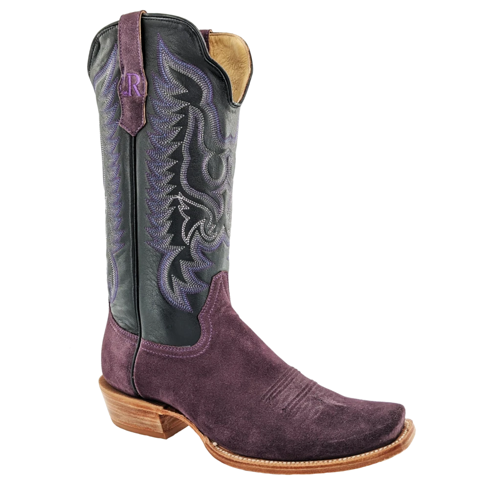 R. Watson presents these plum rough out and black cowhide western boots. These boots have a 10 row stitch pattern, R. Watson comfort system, all leather stacked heel, counters, solid steel shank, and 10 iron outsole. 13″ total in height.