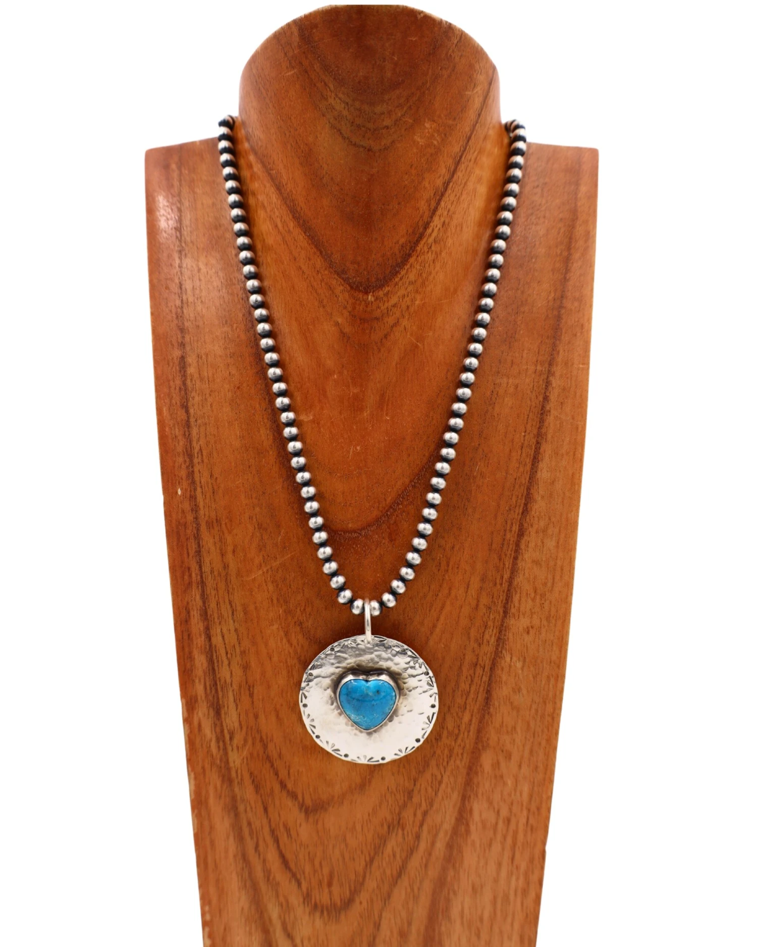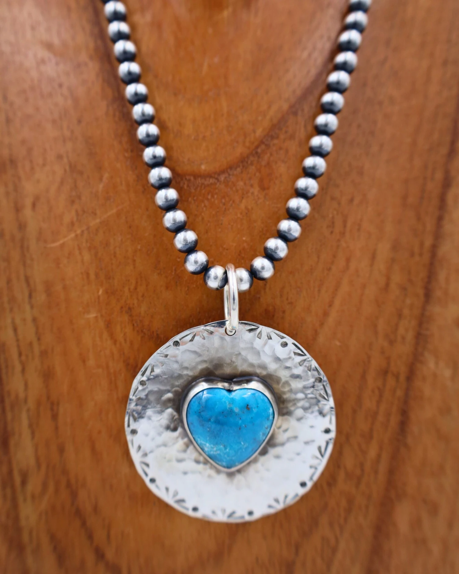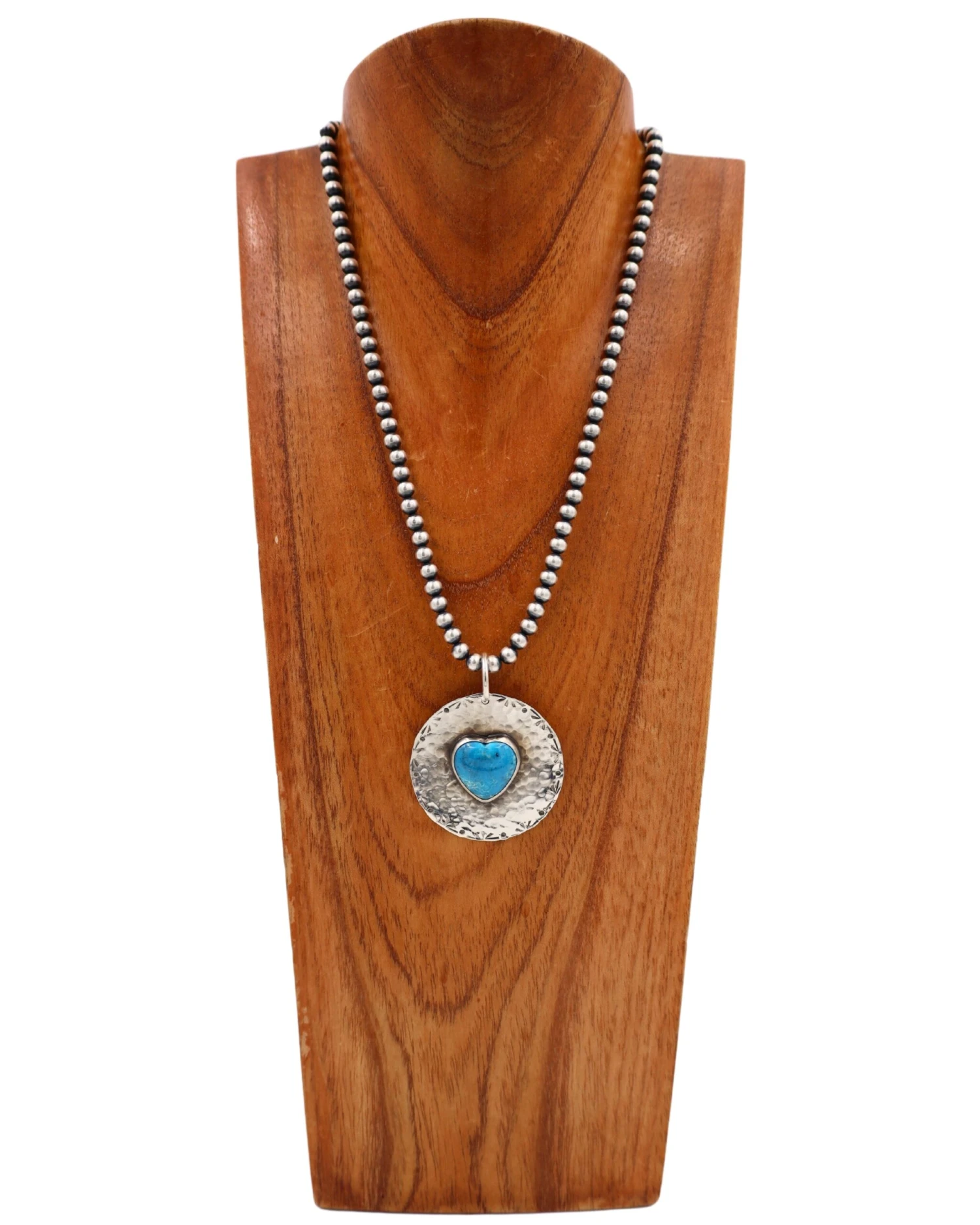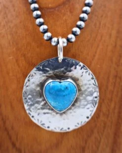 This large pendant handmade by Texas native Richard Schmidt highlights the multifaceted nature of the Turquoise stone. Features a large slab of genuine Turquoise plated on textured Sterling Silver. Though simple in its design, this spectacular pendant is not understated in its beauty!