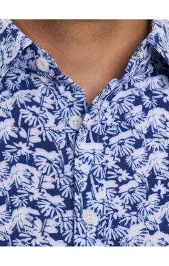 An allover two-tone medium sized floral graphic print splashed over a short sleeve Performance Stretch knit shirt with point collar from Robert Graham.