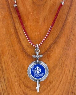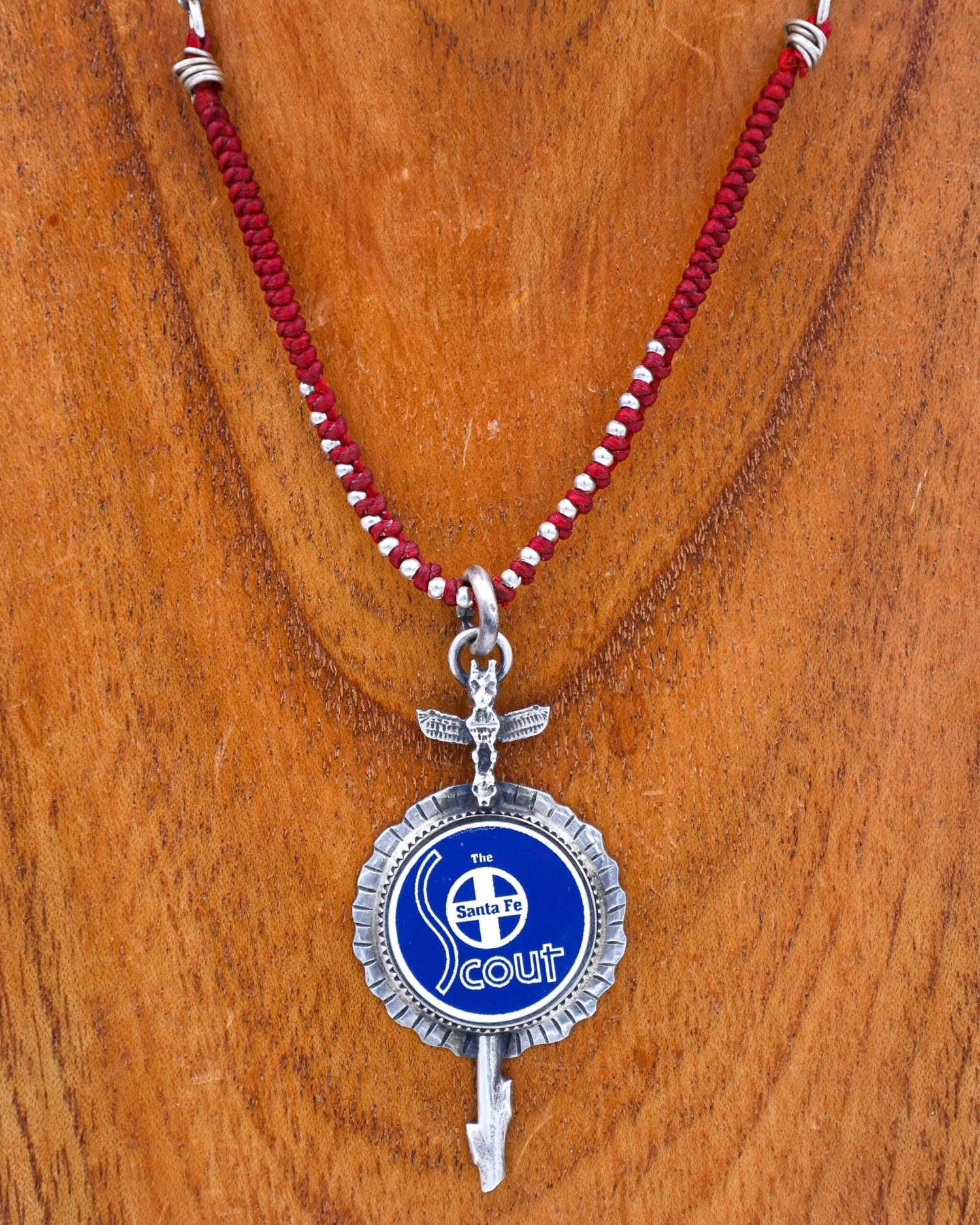This unique necklace handmade in the USA by Sweet Bird Studio combines vintage pieces and modern flair. The Sterling Silver chain is adorned with red weaving and is attached to a unique pendant with a vintage-inspired bottle cap plated on intricately engraved Sterling Silver. This one-of-a-kind piece will add character to any outfit!