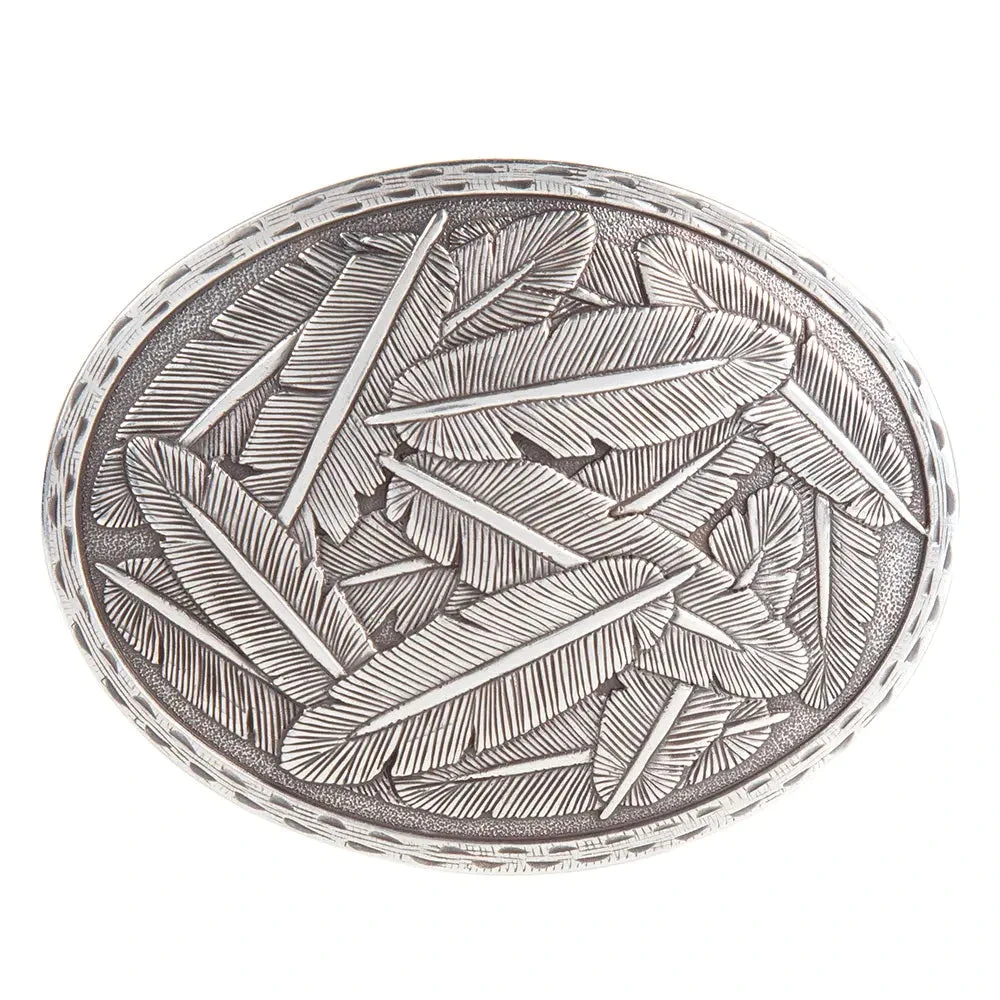 This oval Nocona mens western buckle by M&F Western Products is silver with a stamped edge and scattered feathers all over.