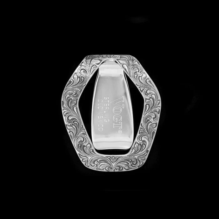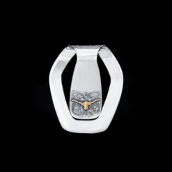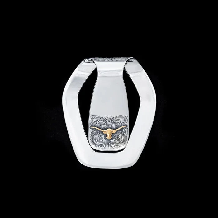 ThisĀ brand new money clip calls to a classic cowboy symbol, the longhorn, with a sleek new design. TheĀ Bandera features a solid sterling silver fully hand engraved front and a polished back with a gold fill longhorn, framedĀ with engraved scrolls. This functional money clip measures 2″ by 2 3/8″, and the open, lightweight design makes for a sharp, timeless look for the cowboy of yesterday and tomorrow.Ā