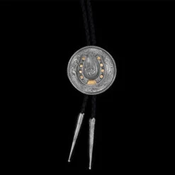 Our Horseman style bolo features a handsome horseshoe figure and is one of our most detailed bolo pieces. This horseshoe design includes a hand twisted sterling rope detail on both the circumference of the disc and the hand cut shoe. Adorned with gold fill nail accents and set onto a 2″ x 2″ round sterling disc. Available with a black cord only.