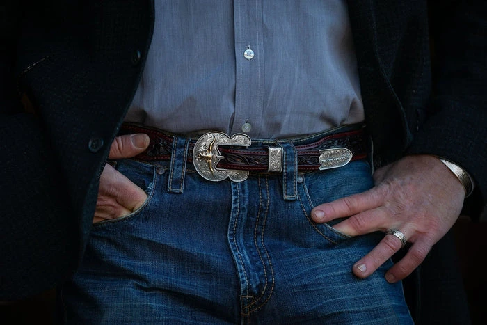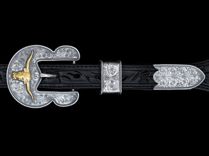 The Longhorn Jackson features our unique Jackson buckle shape for that classic look you have come to know and love from Vogt. This 3 piece set has a gold fill longhorn on the buckle and a hand engraved design framed by a sterling silver rope edge.