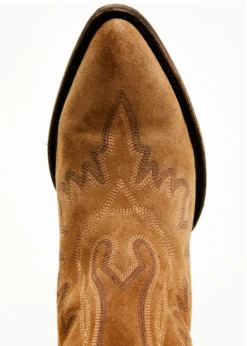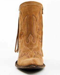 Get your business together, because these is a new Sheriff in town. Rich tan suede leather with tonal stitching and fringe details, elevated in a fashion forward silhouette with a higher heel and almond toe. Inside zipper for added convenience.Â